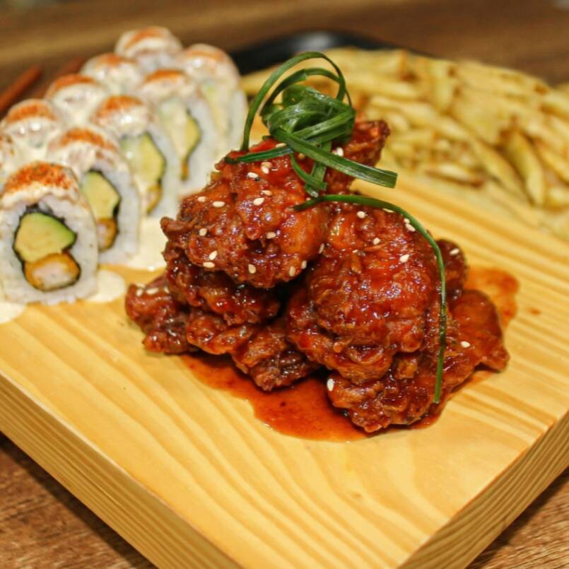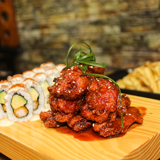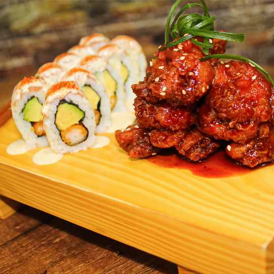 Langostino furai, queso crema, pollo deshilachado, salsa BBQ.