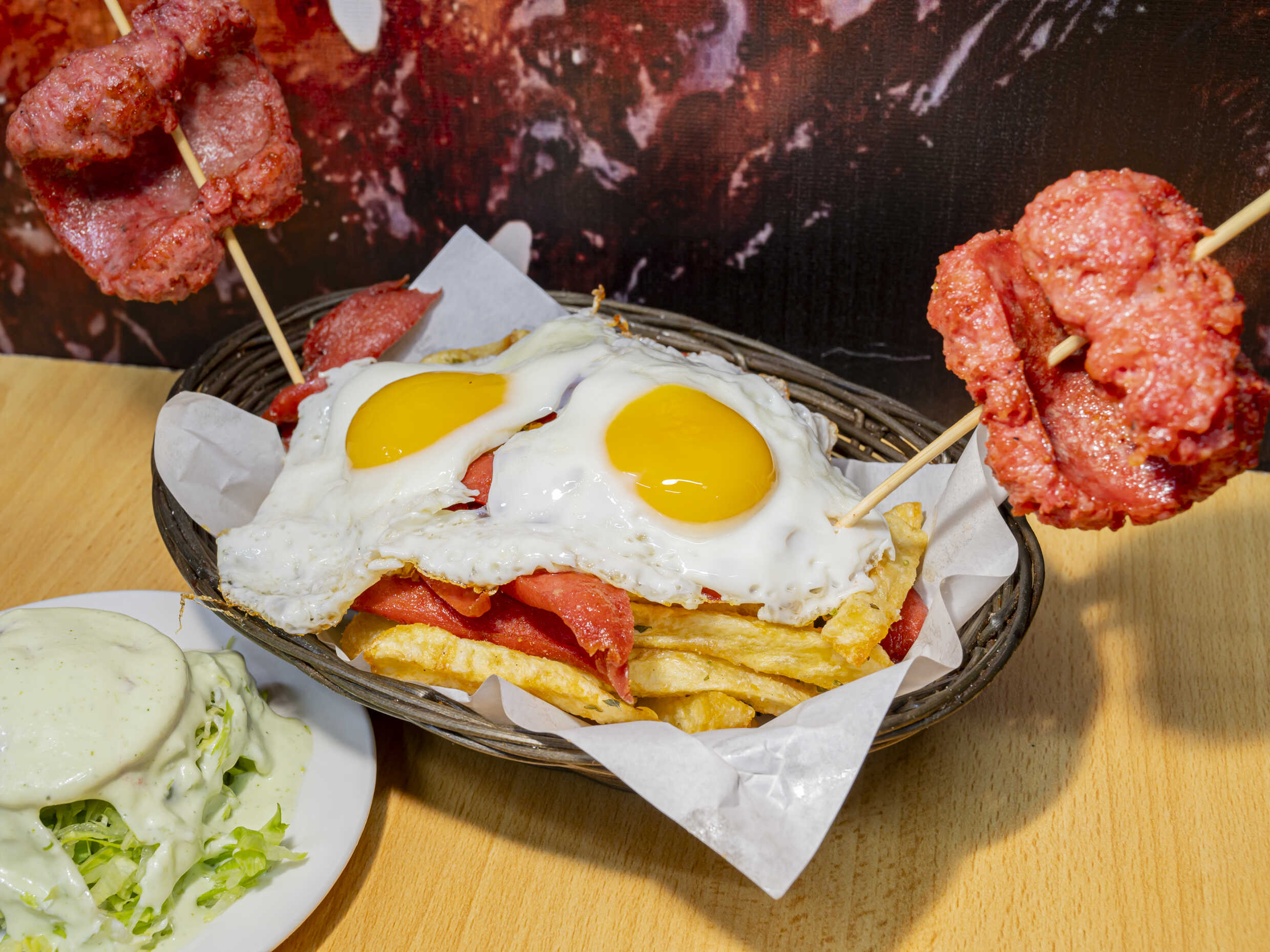 Salchipapa con salchicha ahumada, huevo, plátano frito, papas en finas hierbas, ensalada del día y 3 cremas a elegir.