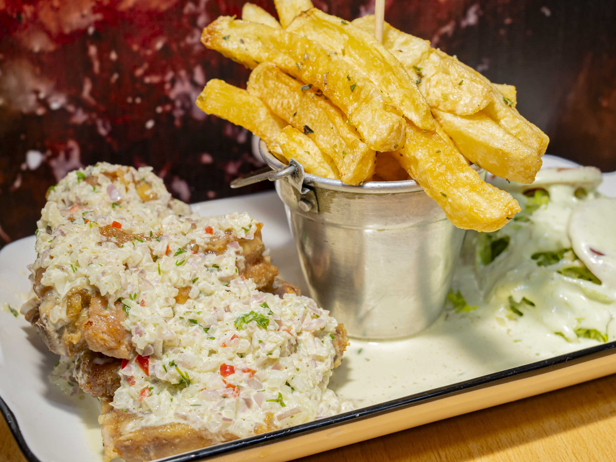 Ala de pollo crispy con preparación, 3 cremas a elegir, papas en finas hierbas y ensalada del día.