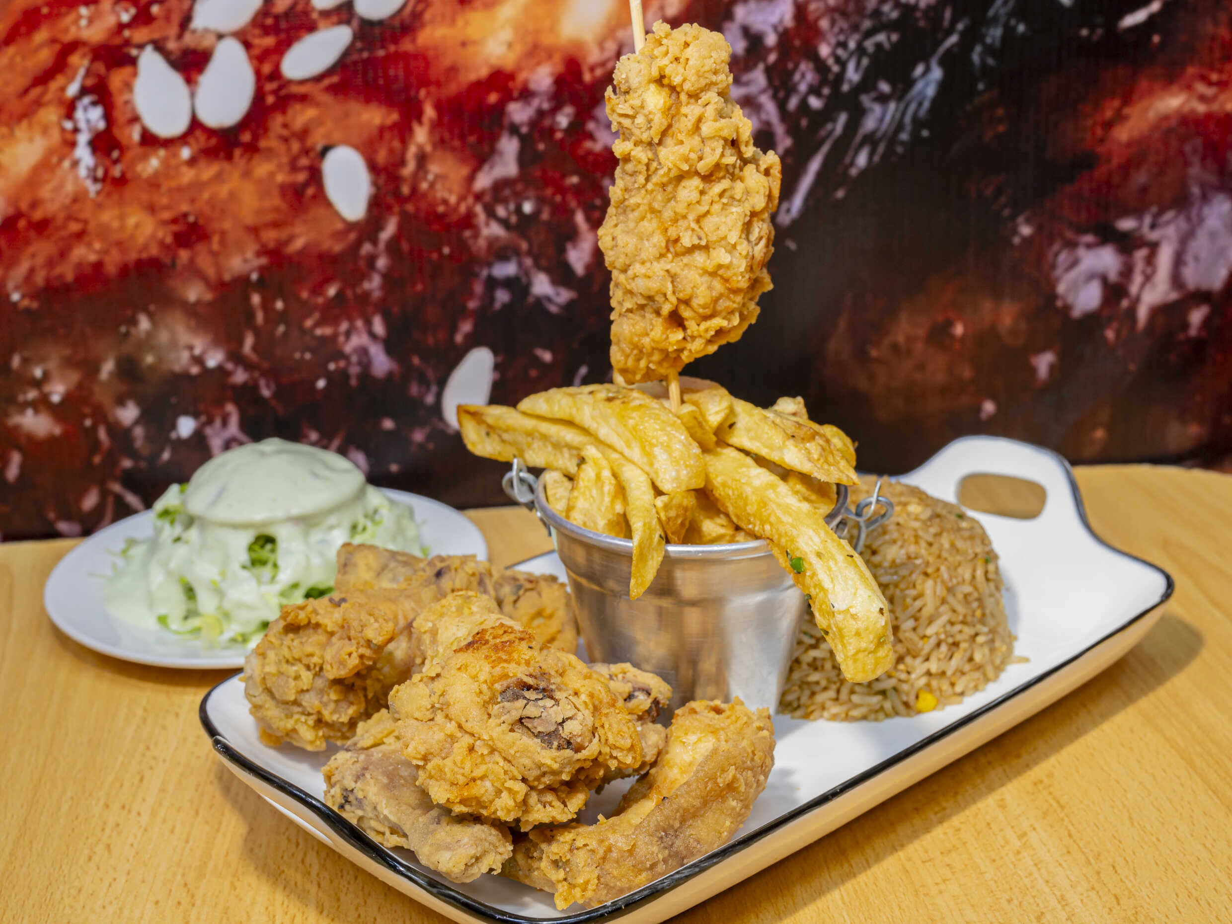 6 Unidades de alitas crispy, lechuga, arroz chaufa de casa, tomate y papas fritas.