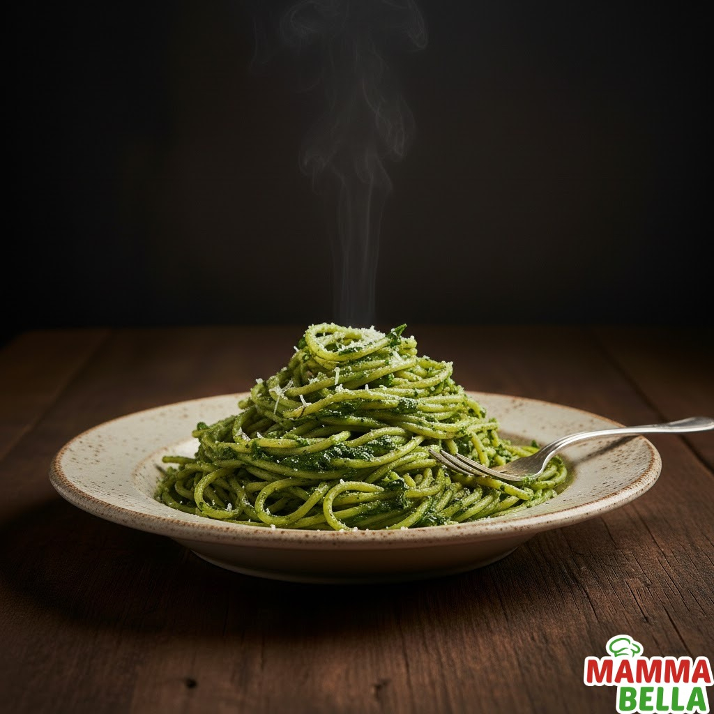 Pasta fettuccine con salsa verde fresca.
