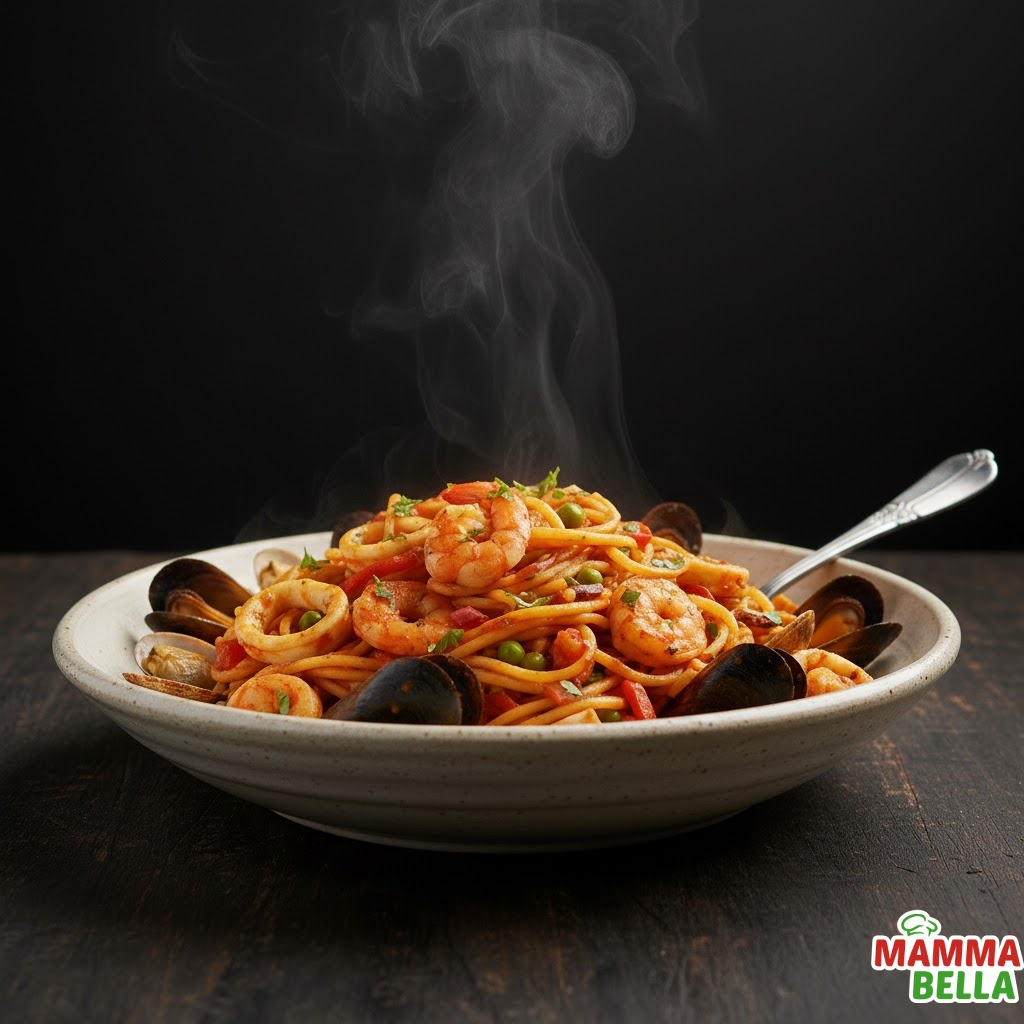 Pasta fettuccine con una mezcla de mariscos frescos.