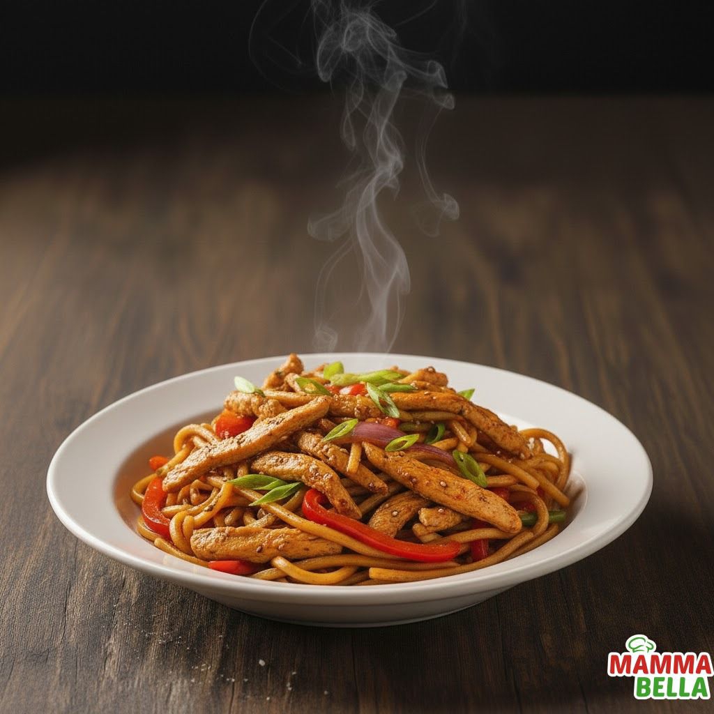 Fideos salteados con pechuga de pollo, cebolla, tomate fresco, pimiento, cebollín y salsa de tomate.