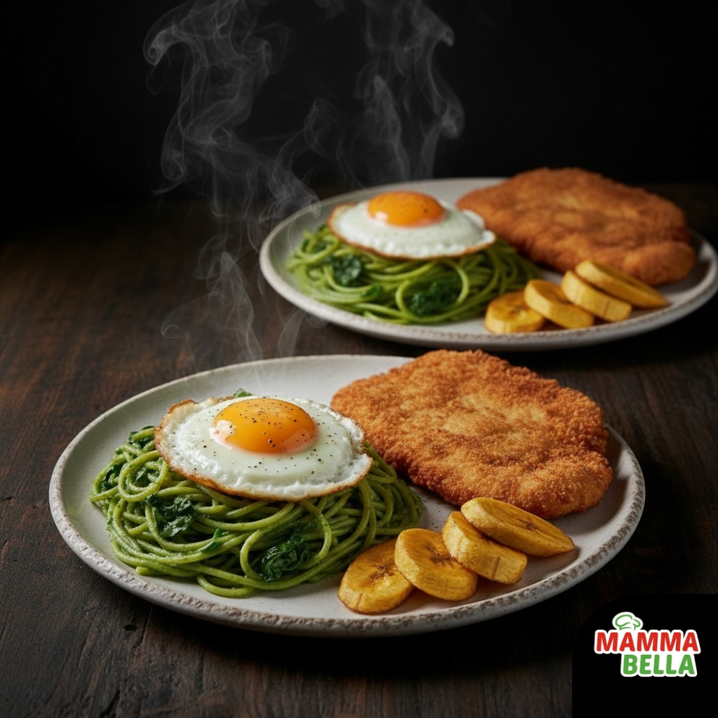 2 Tallarines Verdes con Milanesa a Lo Pobre.