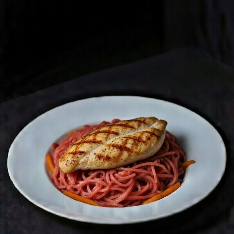 Plato de tallarín rojo con pollo