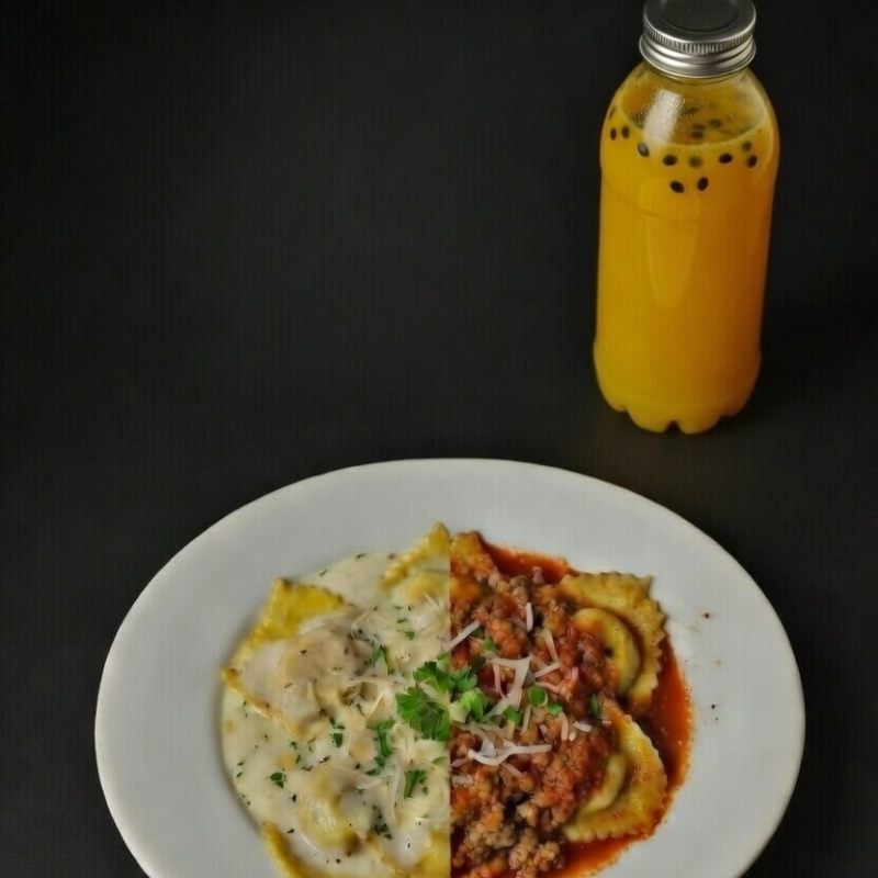 Plato de dúo de ravioles Alfredo y Boloña con bebida.