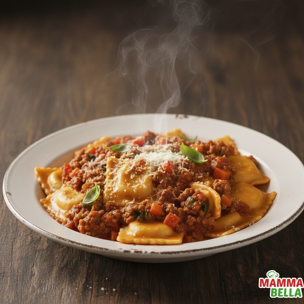 Ravioles rellenos bañados en la clásica salsa de carne y tomate.