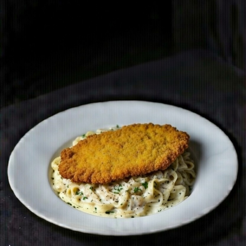 Tallarín Alfredo con Miilanesa de Pollo