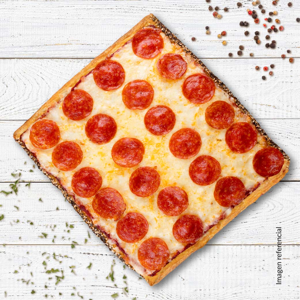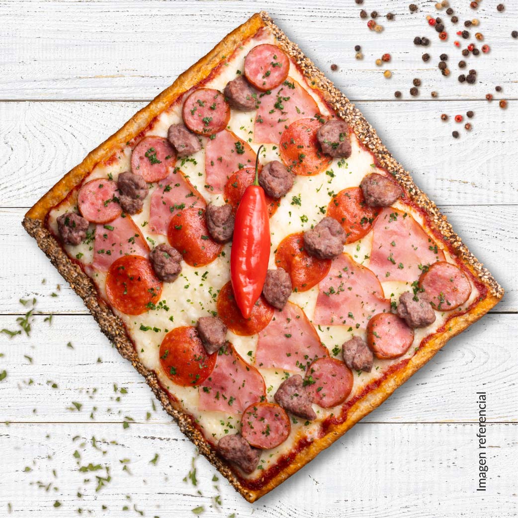 Pizza mediana con carne de res, chorizo ahumado, pepperoni y lomo ahumado.
