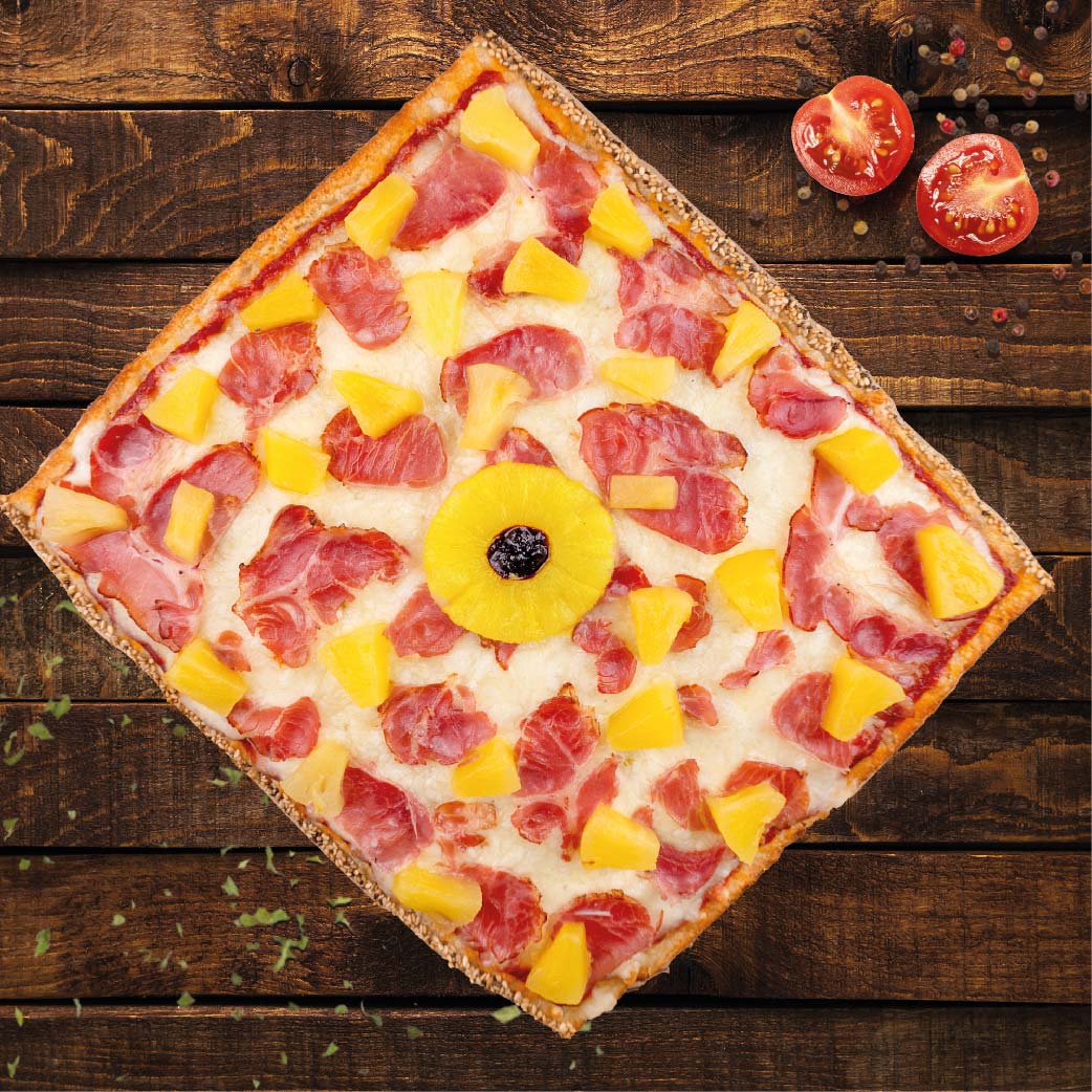 Pizza mediana con pollo crocante, piña en trozos, tomate italiano y salsa BBQ.