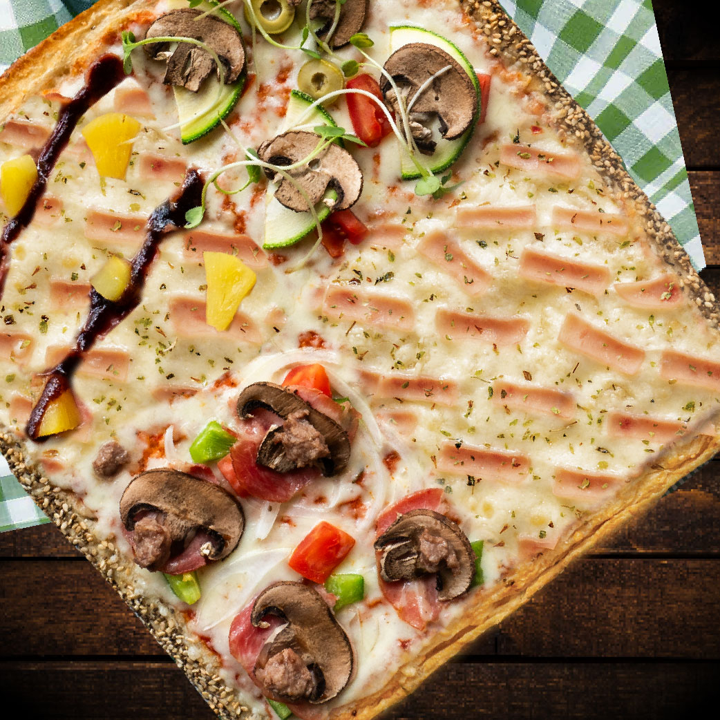 Pizza grande jamón bondiola ahumada, pepperoni, carne de res, champiñones portobellos, tomate italiano, aceitunas verdes, cebollas blancas, pimiento verde y parmesano.
