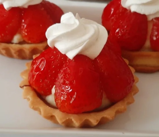 Tartaleta crujiente con crema pastelera y fresas frescas decorada con chantillí; un postre elegante y delicioso.