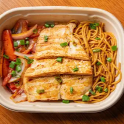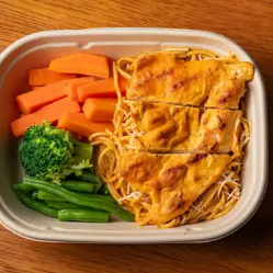 Kcal: 623 / Prote: 46g / Carbs: 86g / Grasas: 8g. Los tallarines rojos de siempre con una jugosa porción de pollo a la plancha.