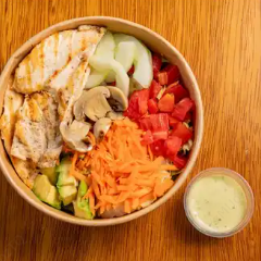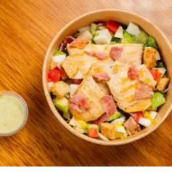 Kcal: 333 / prote: 43g / carbs: 71g / grasas: 15g. Bowl con los mejores y más frescos ingredientes saludables, tocino, pechuga, tomate, palta, queso, huevo, espinaca, crutones y salsa ranch.