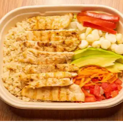 Kcal: 642 / Prote: 38g / Carbs: 61g / Grasas: 18g. Elige tu proteína sobre una base de arroz integral, mix de verdes, brócoli, coliflor, pimiento, choclo, cebollita china.