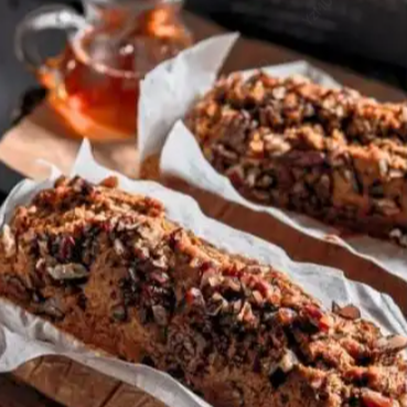 Kcal: 230 / Prote: 8g / Carbs: 36g / Grasas: 13g. Harina de avena, harina de arroz blanco, almidón de yuca, plátano, pecanas, azúcar de coco, aceite de coco, huevos, vainilla, sal de Maras, vainilla.