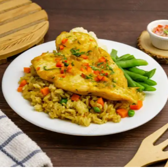 Kcal: 725 / Prote: 40g / Carbs: 98g / Grasas: 15g. Nuestro espectacular arroz con pollo, con los mejores ingredientes.