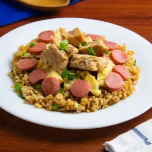 Kcal: 723 / Prote: 48g / Carbs: 53g / Grasas: 17g. El inconfundible chaufa en una presentación sin culpas. Pollo con nuestra salsa oriental, salchicha de pollo y cebolla china.