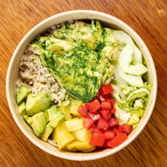 Kcal: 774 / prote: 41g / carbs: 73g / grasas: 17g. Elige tu proteína sobre una base de arroz integral, mix de verdes, pesto, pepino, papa en cubos, palta, tomate.