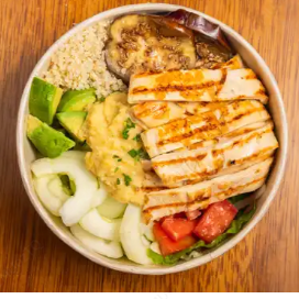 Kcal: 484 / Prote: 40g / Carbs: 48g / Grasas: 13g. Bowl saludable con las más frescas hortalizas, quinoa, tomate, cebolla, palta, pepinillos, pechuga al grill, berenjenas y una deliciosa vinagreta de yogurt.