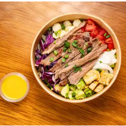 Kcal: 597 / Prote: 43g / Carbs: 71g / Grasas: 18g. Bowl saludable con las más frescas hortalizas, aguacate, crutones, choclo, pepinos, cebollín, cebolla en plumas, col rizada y bistec de res.