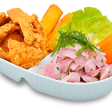 Trozos de pescado macerado en una salsa choza, pasada por harina y fritos en aceite vegetal coronado con salsa criolla.