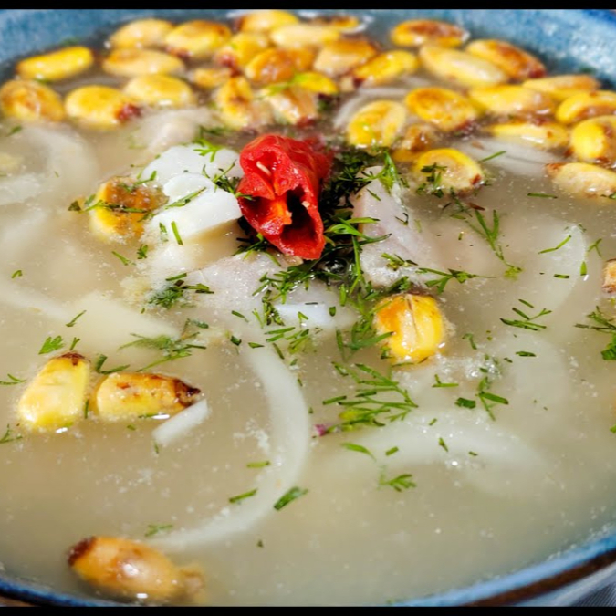 Concentrado de chilcano salteado con cebolla, pescado cabrilla, tomate y ají amarillo, acompañado de yucas.