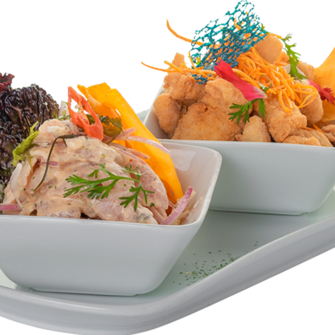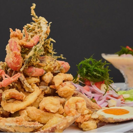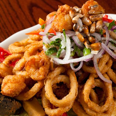 Arroz con mariscos, chaufa de mariscos, ceviche mixto, chicharrón mixto o chicharrón de pollo. Para 4 a 6 personas.