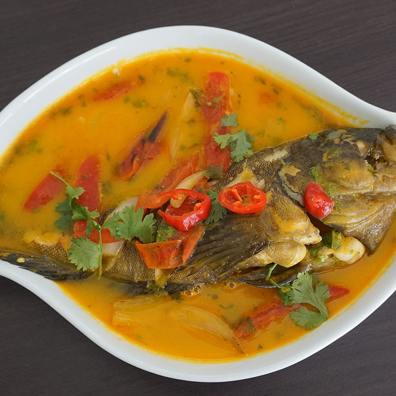 Parihuela de tramboyo, acompañada de mariscos y cangrejo bañado en leche de tigre.