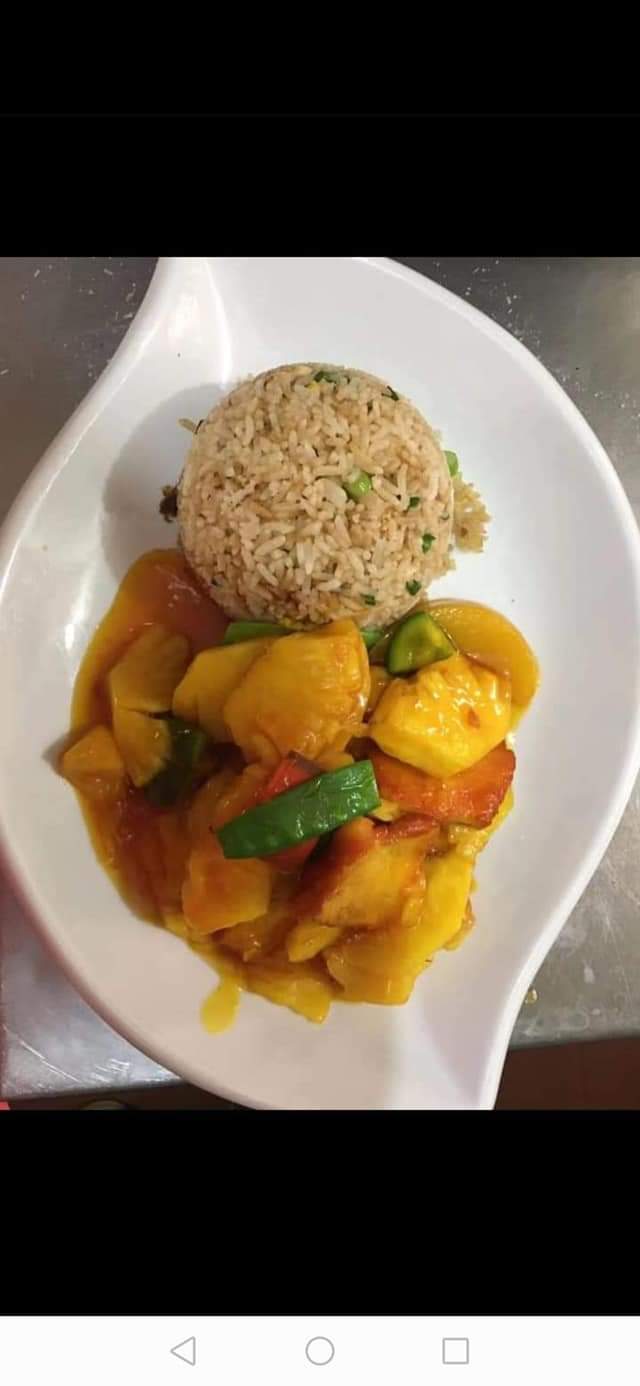 Carne de chancho en tiras con piña en trozos, acompañados de arroz chaufa.