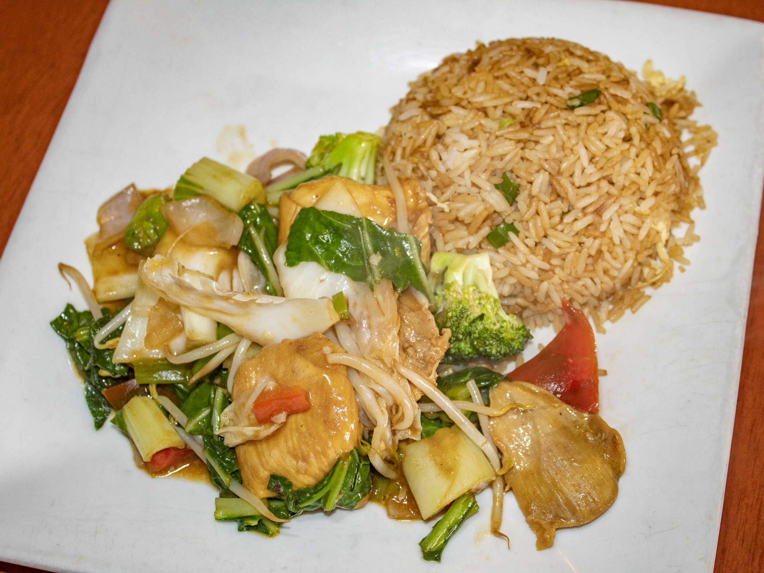 Pollo con verdura (salado) y pollo con piña (dulce).