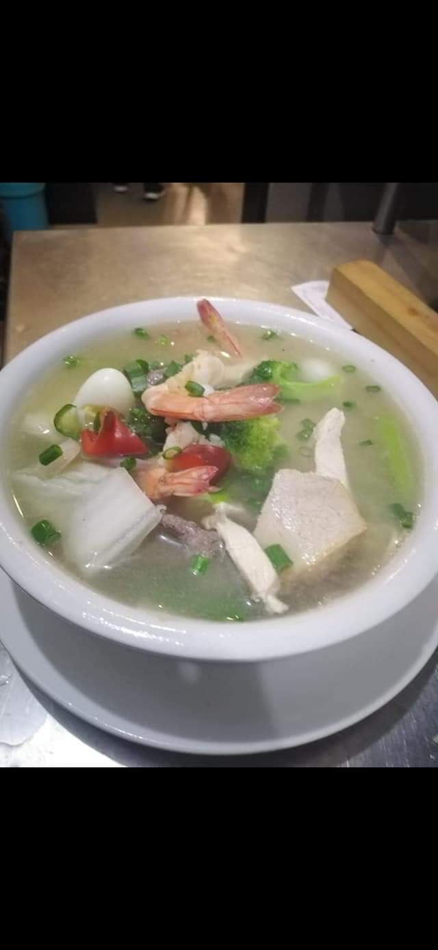 Sopa con pollo, chancho, carne de res en trozos, col china, fideo chino, kion, huevo de codorniz y aceite de ajonjolí.
