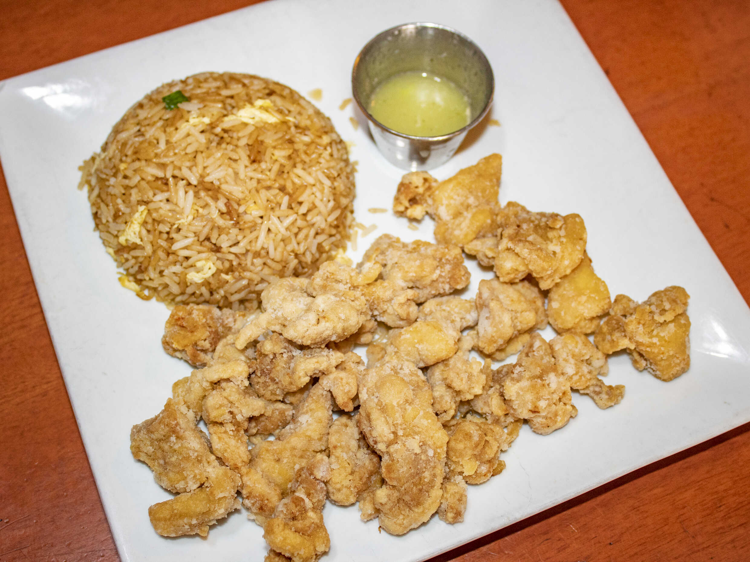 2 uds de alitas empanizadas y piña en trozos, acompañados de arroz chaufa.