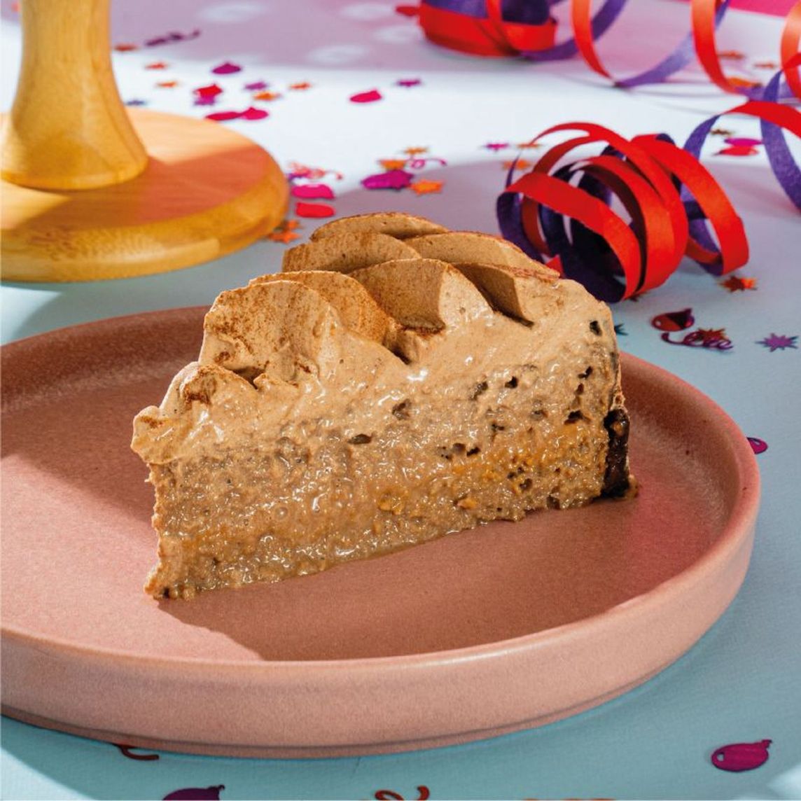 Porción de deliciosa base de galleta de chocolate, con crema de queso y avellanas. Foto referencial*