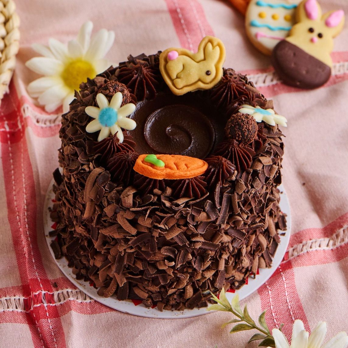 Mini torta de chocolate decorada con flores de chocolate celeste y galletitas de forma de conejo y zanahoria. Perfecta para regalar.