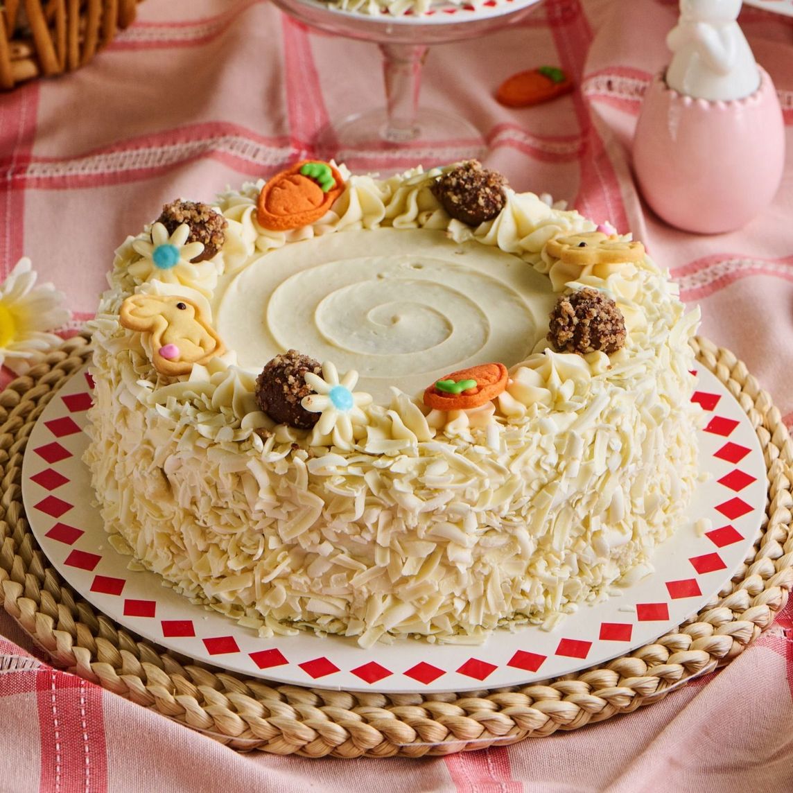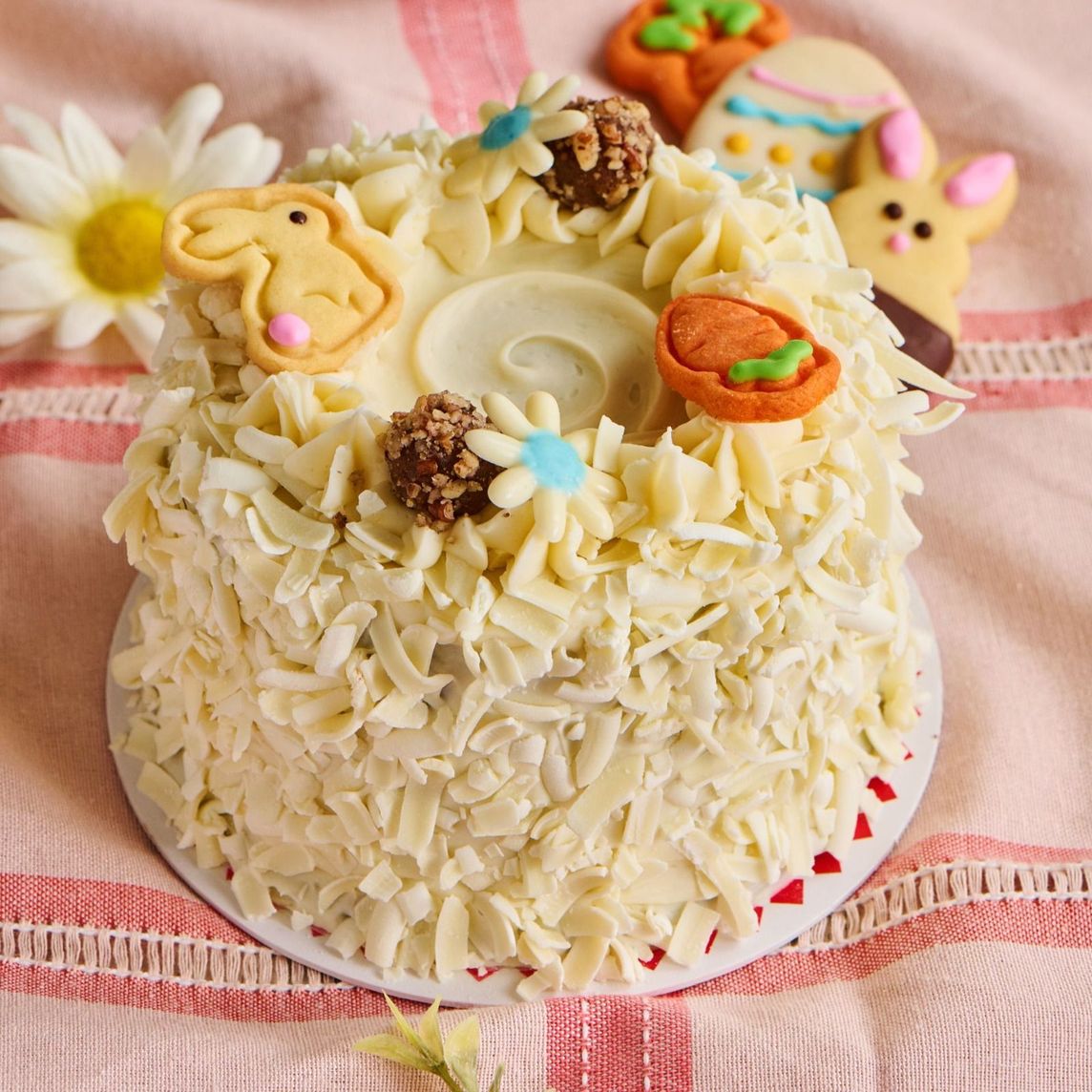 Mini versión de nuestro Carrot Cake decorado con galletitas de vainilla de conejo, zanahoria y con flores de chocolate celeste. Un detalle lleno de sabor.