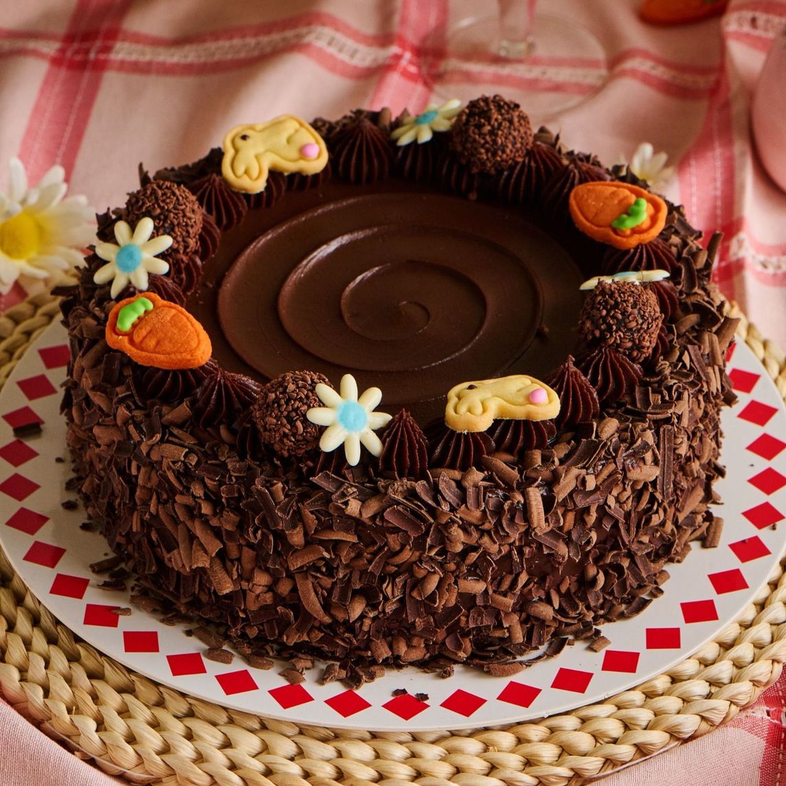 Decorada con flores de chocolate celeste, mini galleta de vainilla en forma de conejo y zanahoria y con trufas de chocolate.