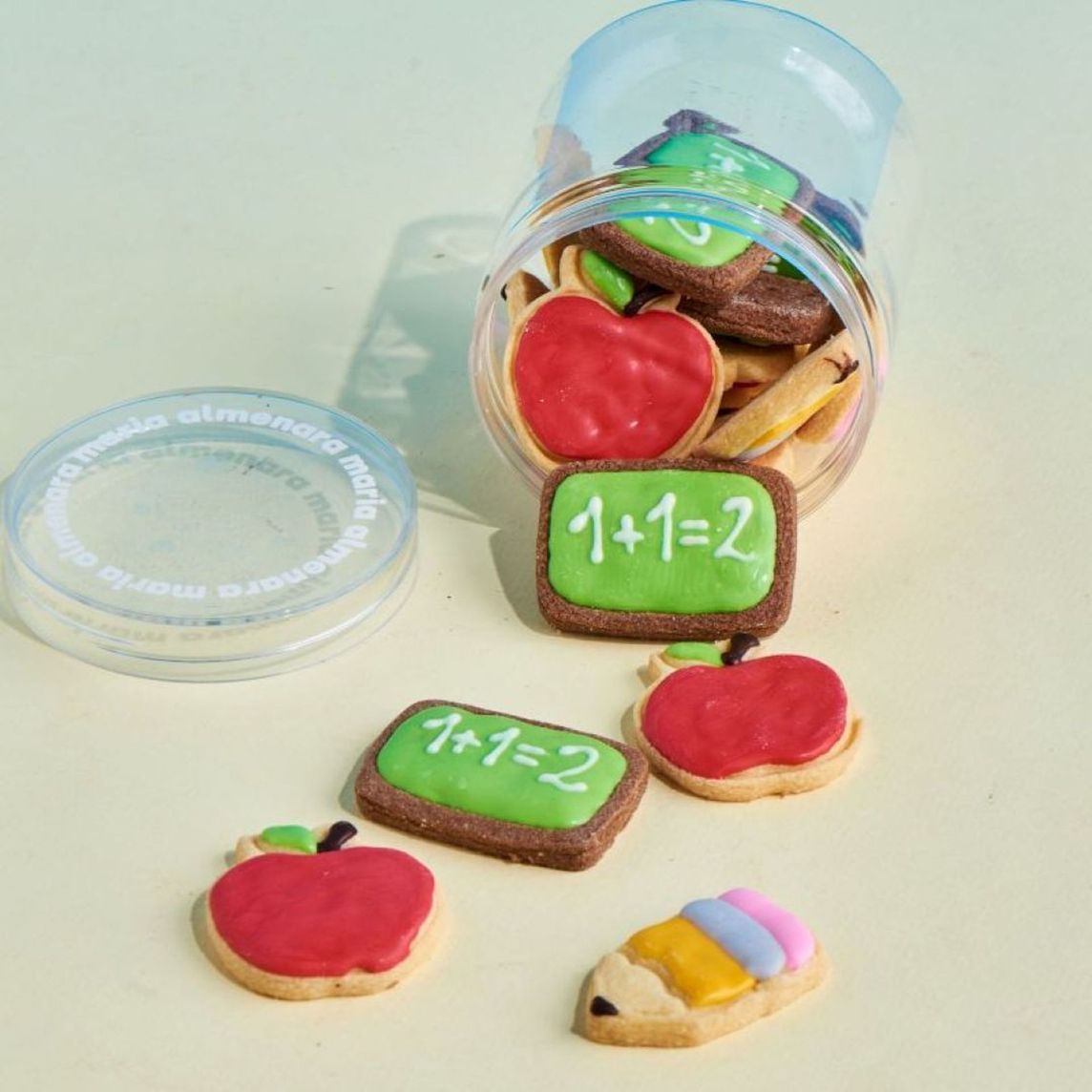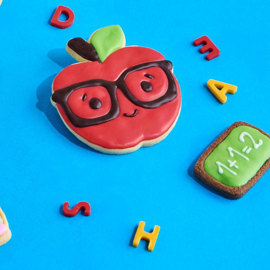Galletitas artesanales decoradas en forma de manzana, lápiz y pizarra.