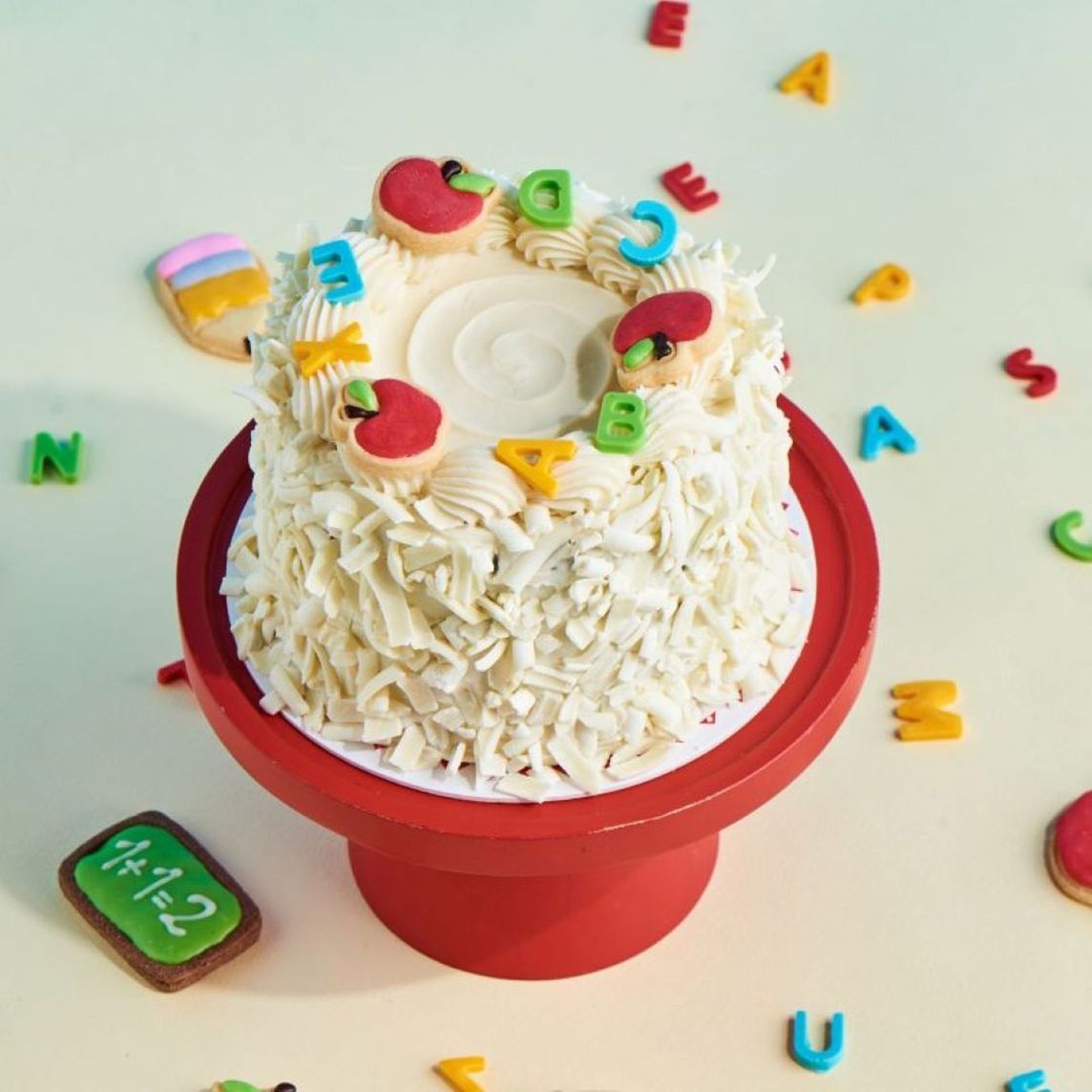 Mini version de nuestro carrot cake decorada con 3 galletas en forma de manzana y letras de chocolate de colores.