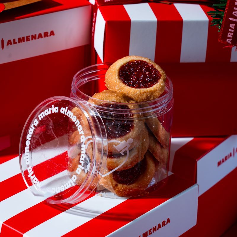 Galletas de mermelada rellenas con mermelada de fresa y presentadas en un práctico pomo perfecto para llevar y compartir.