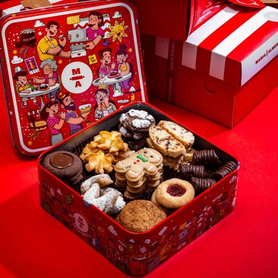 Selección especial de galletas y bocaditos: cachito de pecanas, conitos rellenos de manjar, biscottis de cranberries, galletas de mantequilla, galletitas rellenas de mermelada de fresa, choco avellana, canela, y el clásico muñeco de jengibre.