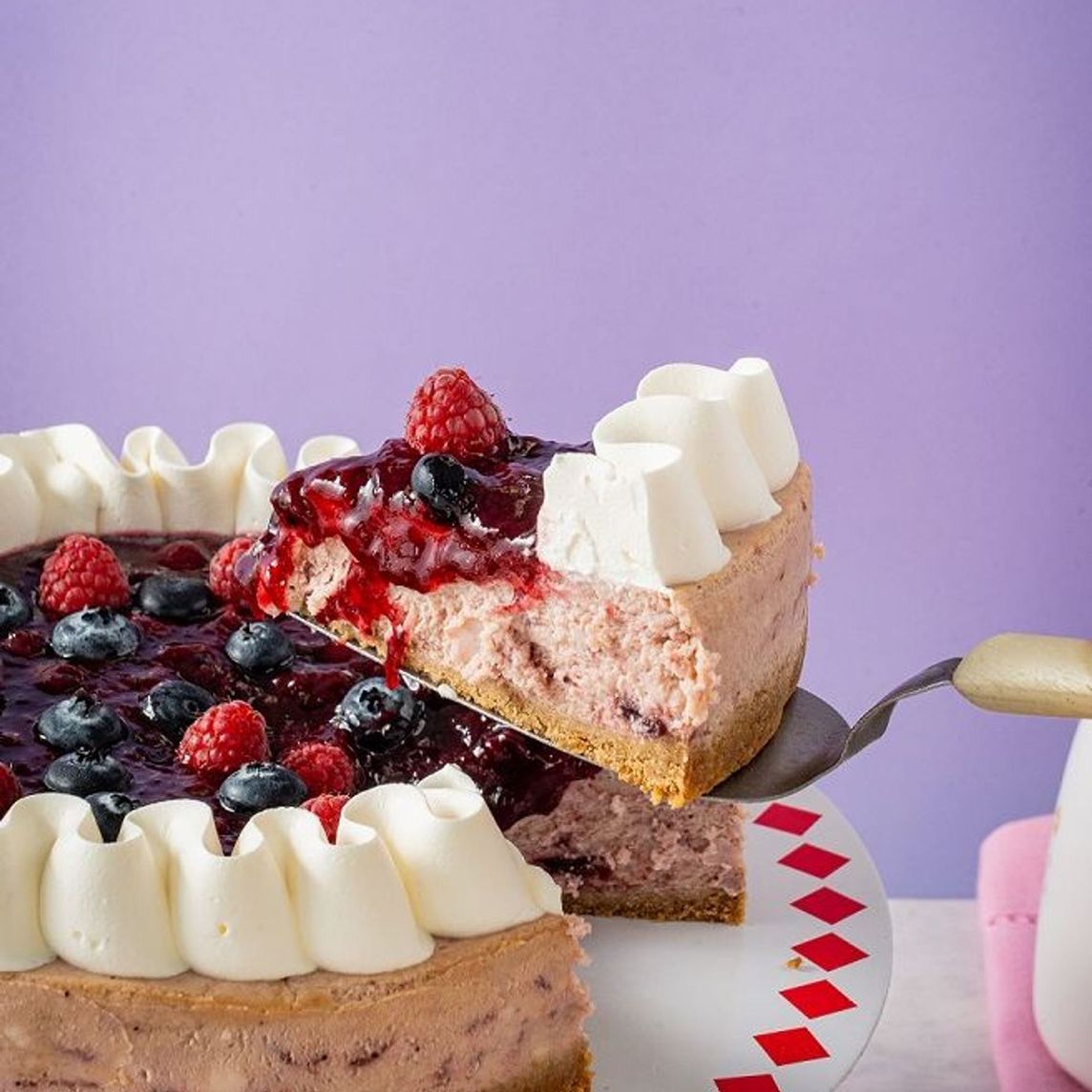 Porción cheesecake con base de galleta, mezcla de crema de queso, frutos rojos bañado en su salsa.