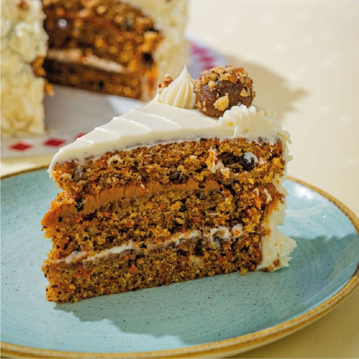 Porción de 3 capas de bizcochuelo de zanahoria con pecanas y especias, relleno y cubierto de frosting de queso crema y manjar blanco. Foto referencial*