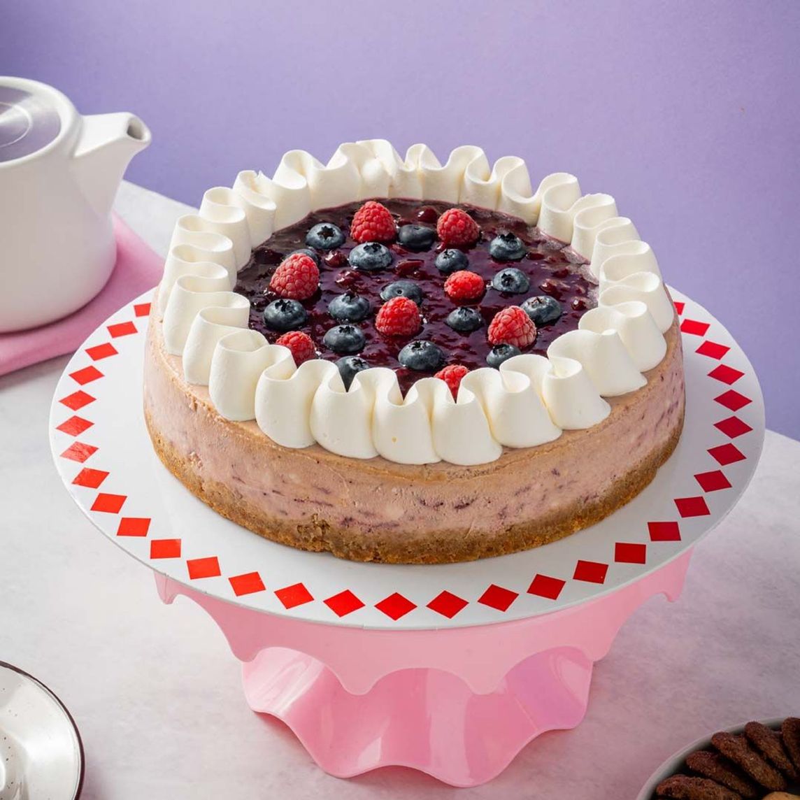 3 discos de keke red velvet, relleno de un mix de frosting de queso crema con chantillí, 2 capas de fudge y blueberries. Aprox 21cm de diámetro.