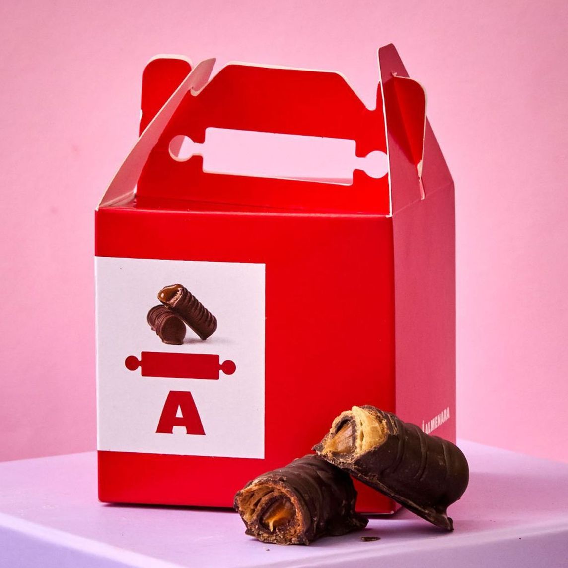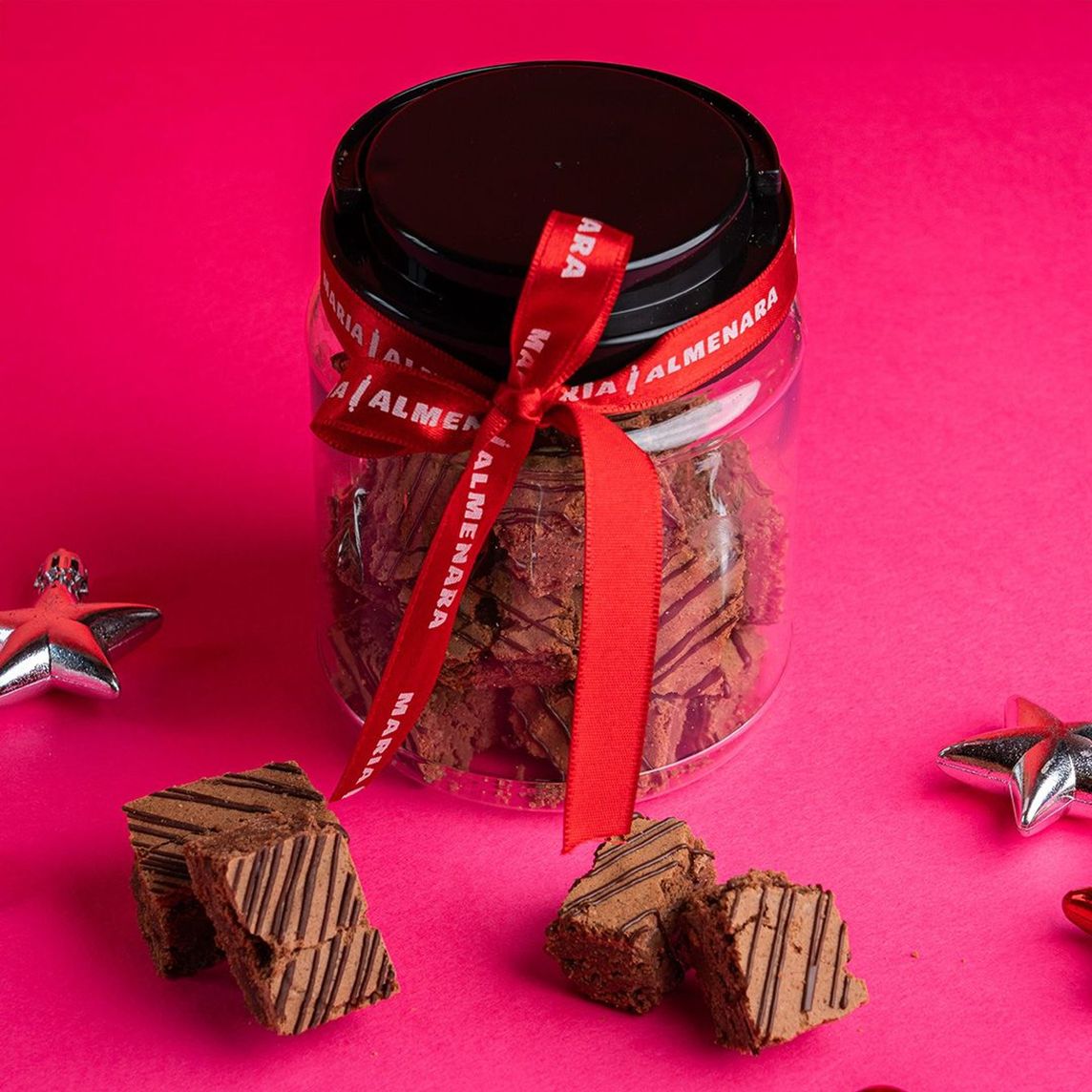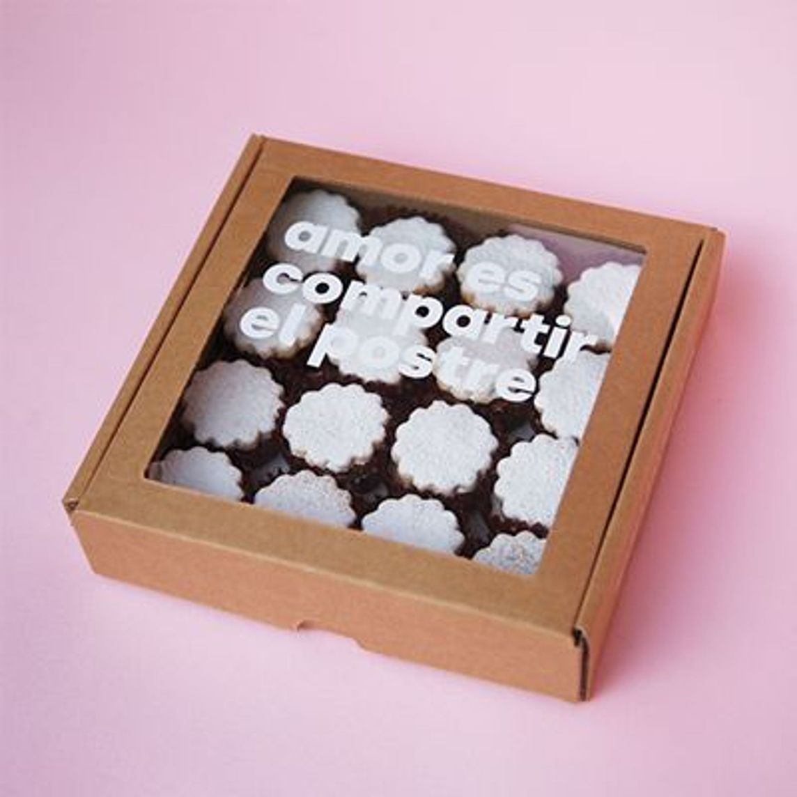 12 mini alfajores + 14 mini brownie amelcochados con pecanas y fudge + 14 mini crocante de manzana con líneas de chocolate blanco