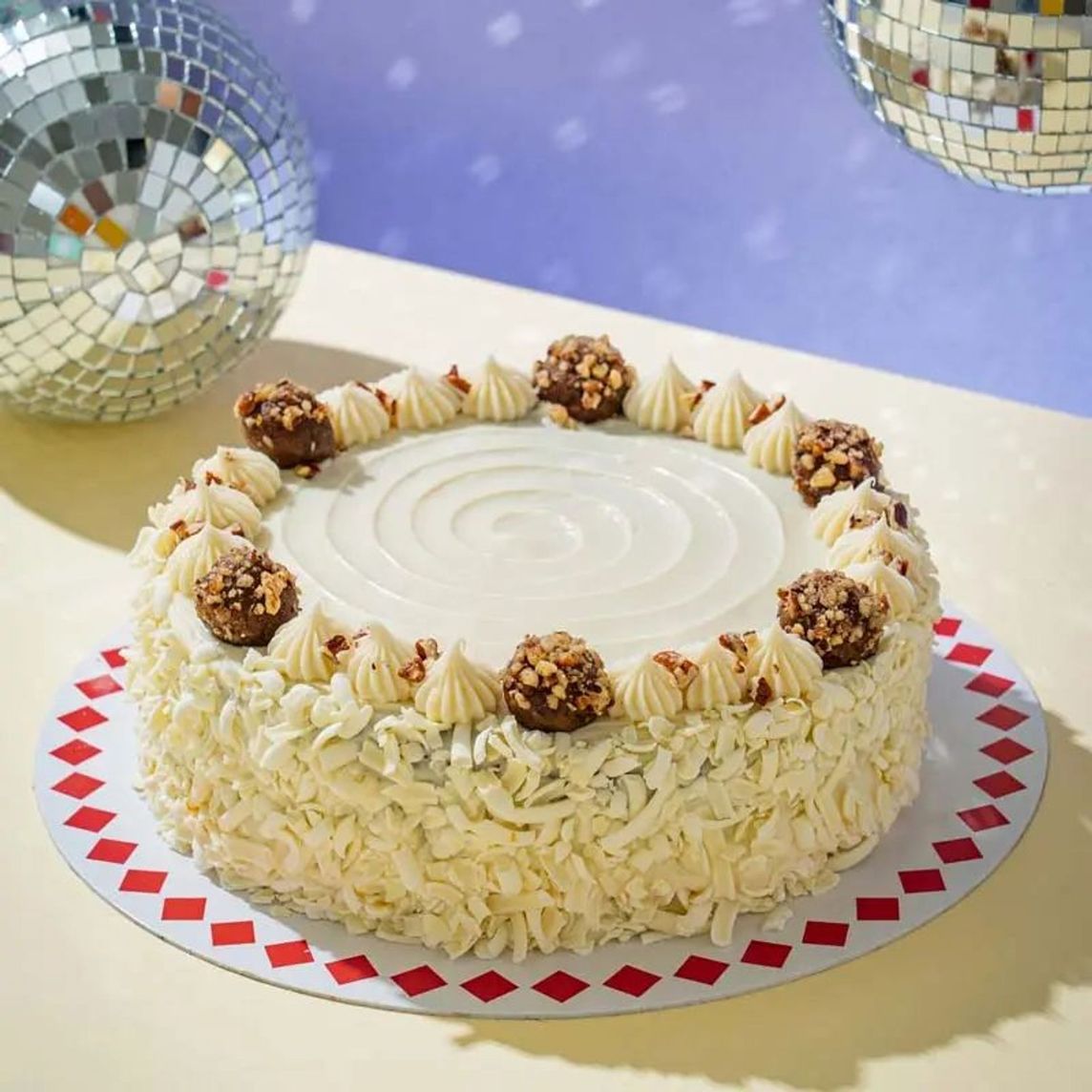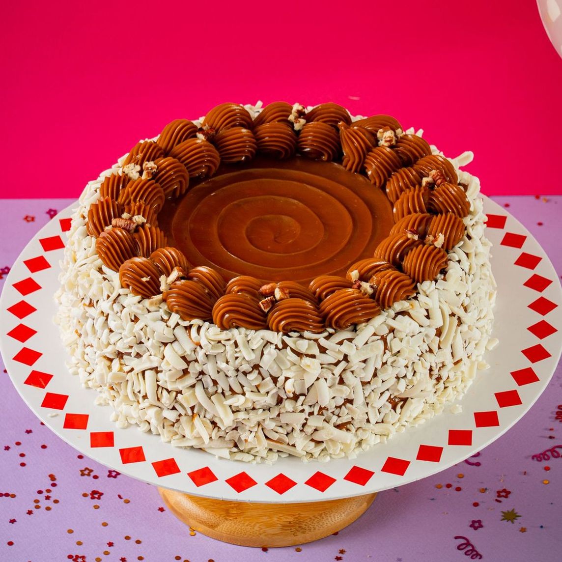 bizcochuelo a base de pecanas molidas, relleno, decorado con manjar blanco, chocolate blanco más pecanas. Aprox 21cm de diámetro
