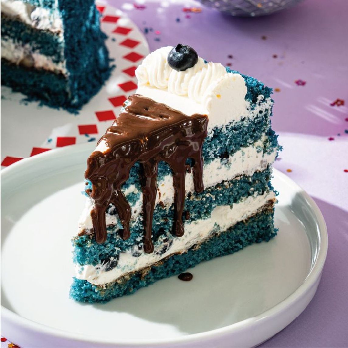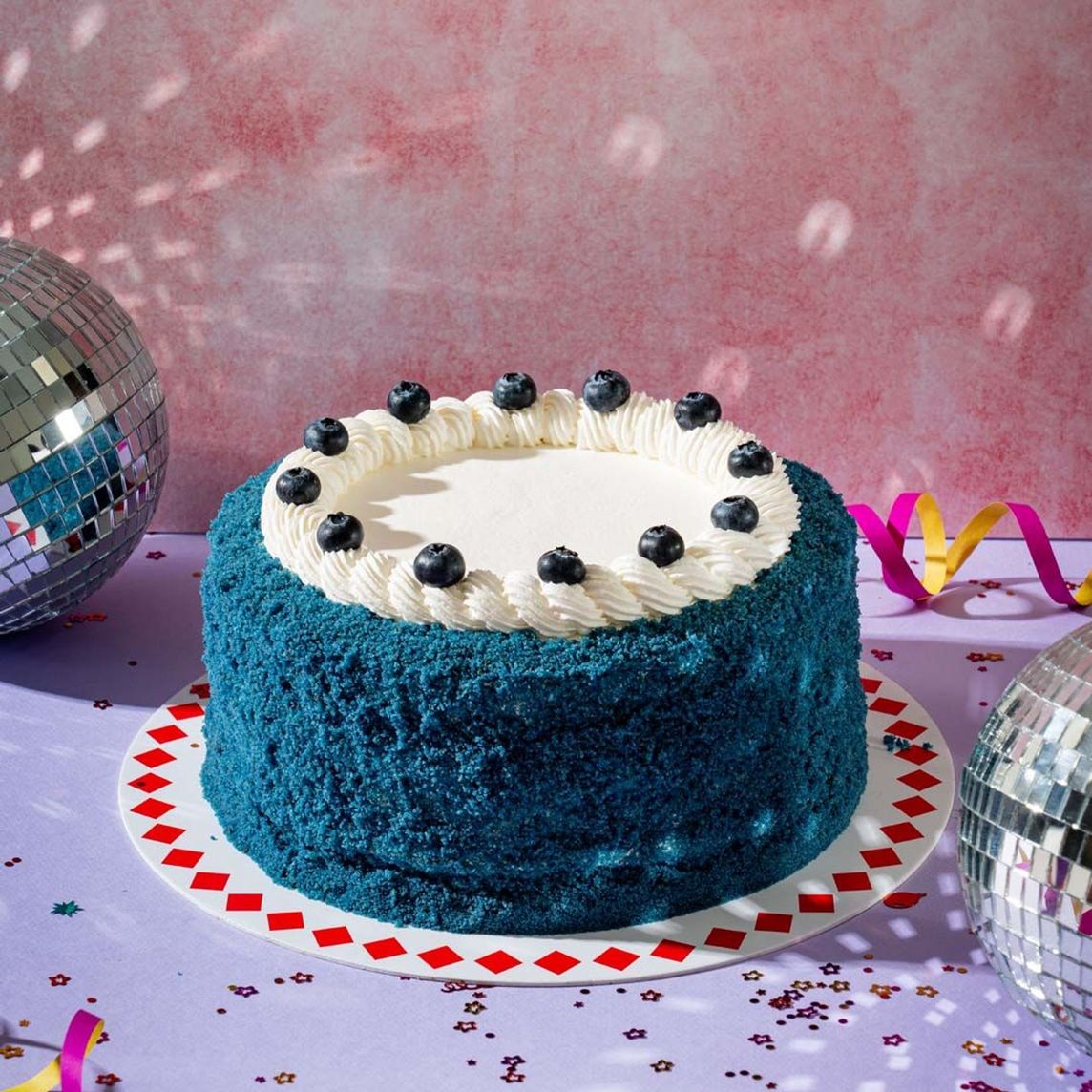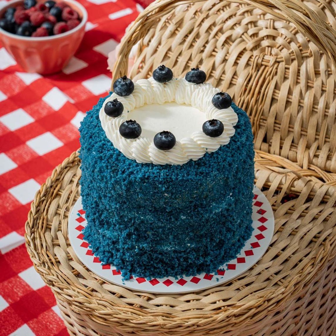 Tres discos de keke blue velvet, relleno de un mix especial de frosting de queso crema con chantillí, fudge y blueberries, bañada de crema de queso, revestido con keke blue velvet y decorado con arándanos.