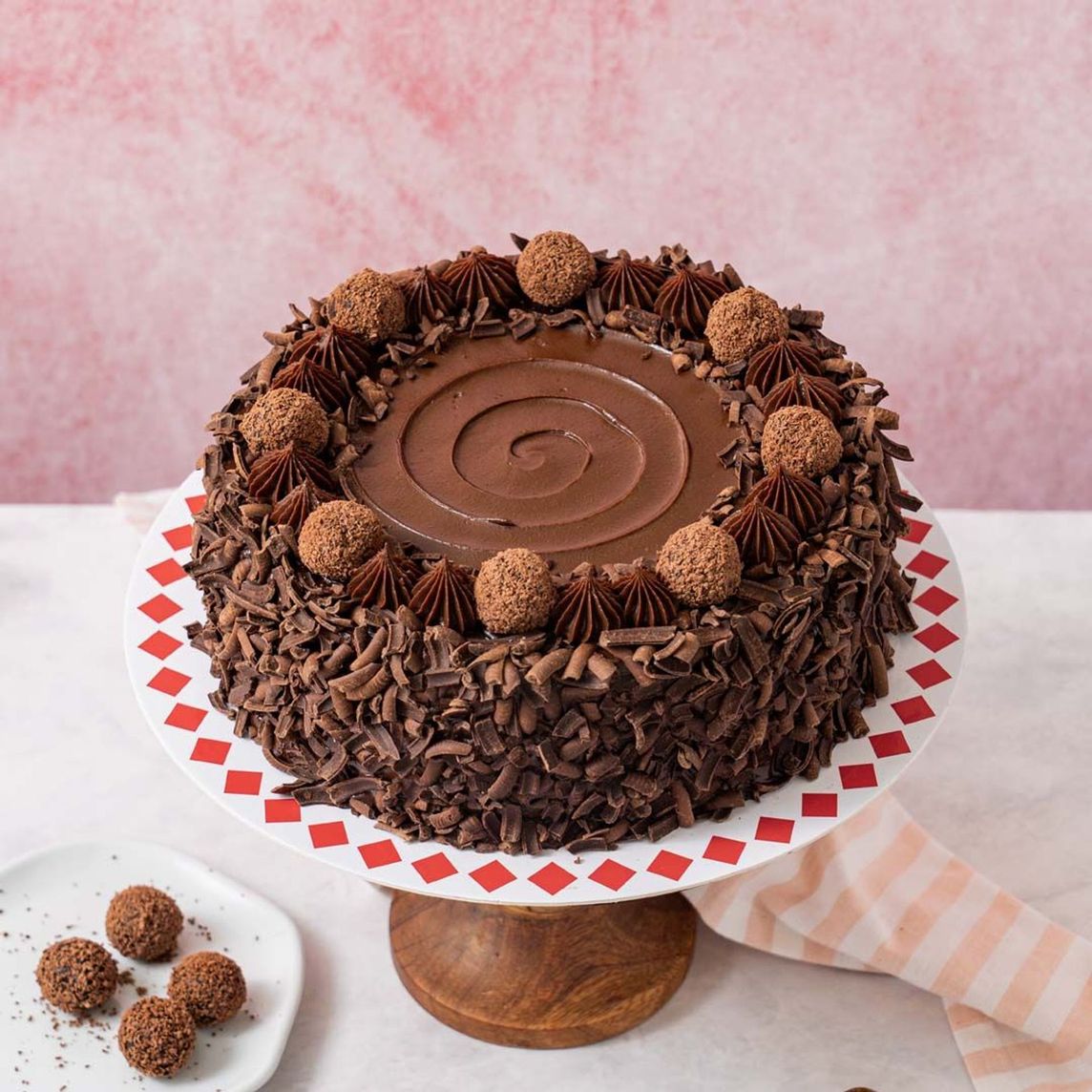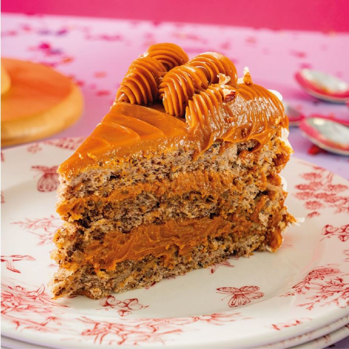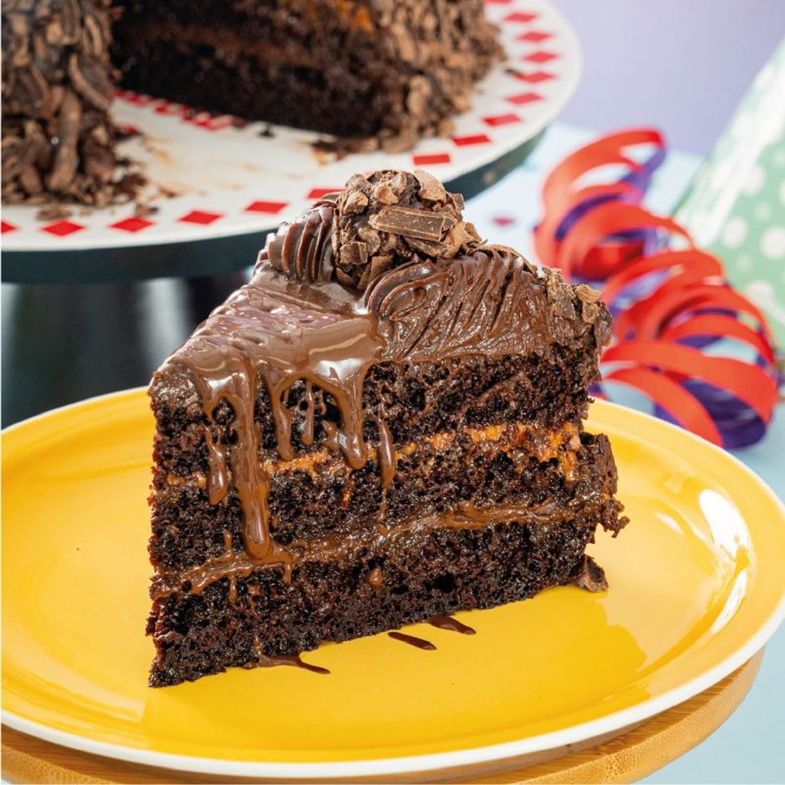 Porción de torta con doble relleno de fudge, manjar y bañado en trufa.