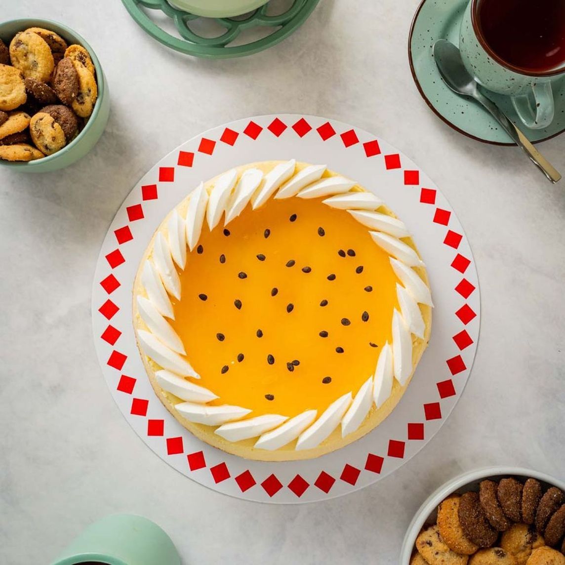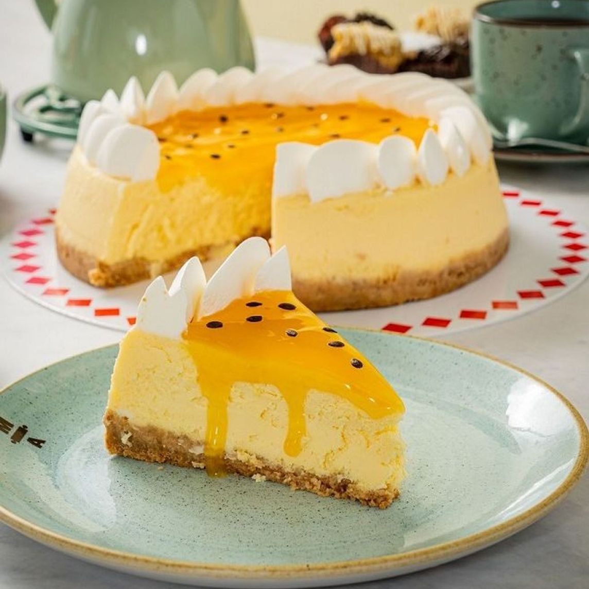 Cheesecake horneado con base de galletas, crema de queso bañado de nuestra salsa artesanal de maracuyá. aprox 20cm de diámetro. Foto referencial*