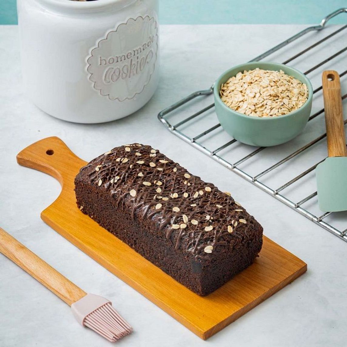 Porción de esponjoso bizcochuelo de pecanas, bañado en delicioso manjar, pecanas y chocolate blanco.